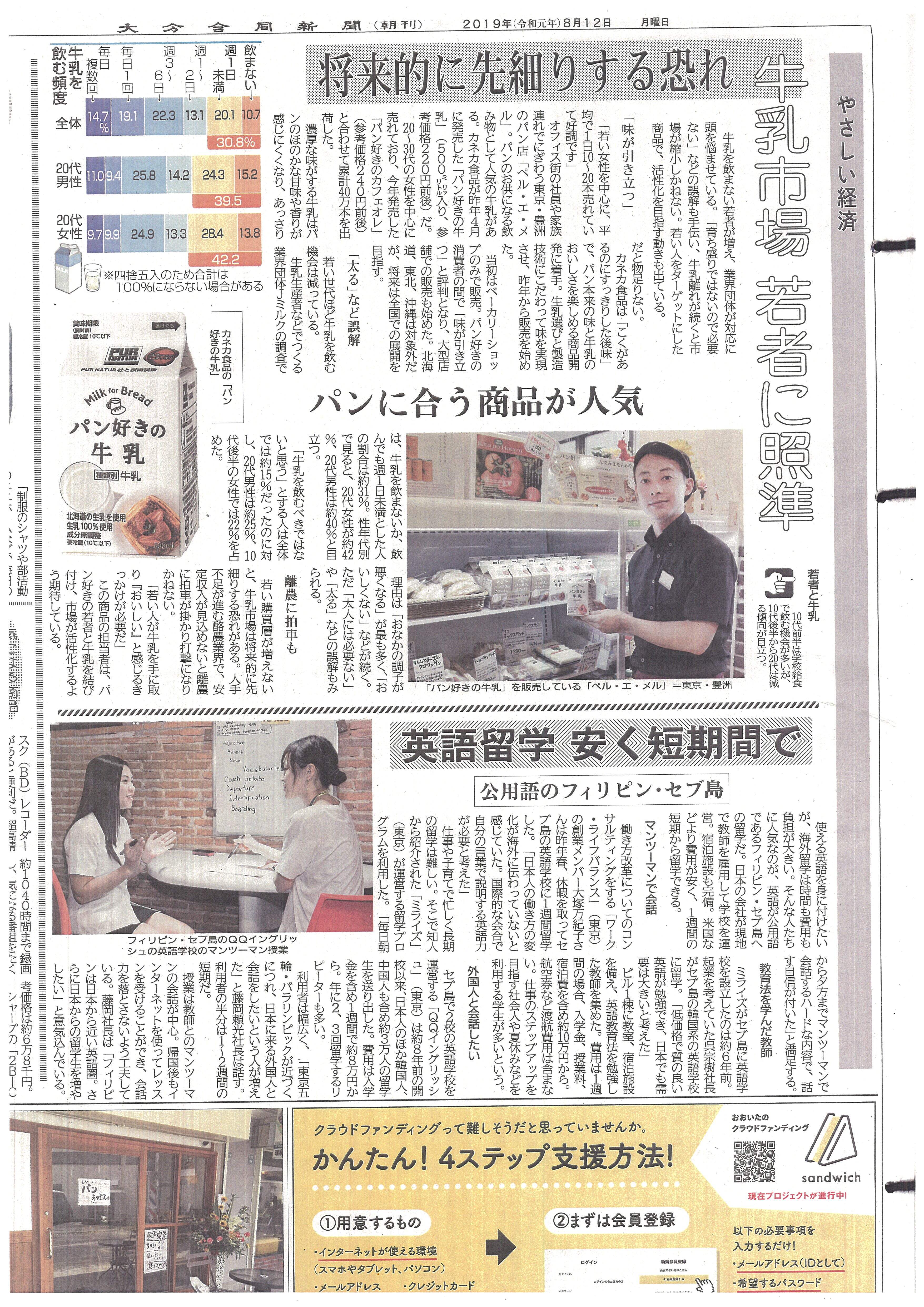 2019.08.23 メディア 大分合同新聞にご紹介いただきました 「大分合同新聞」(大分合同新聞社 2019年8月12日)にて、ミライズ留学をご掲載いただきました。 セブ島留学が流行しているとして、お取り上げいただいております。『英語留学 安く短期間で ー公用語のフィリピン・セブ島ー』 ※クリックすると拡大します Prev Index Next